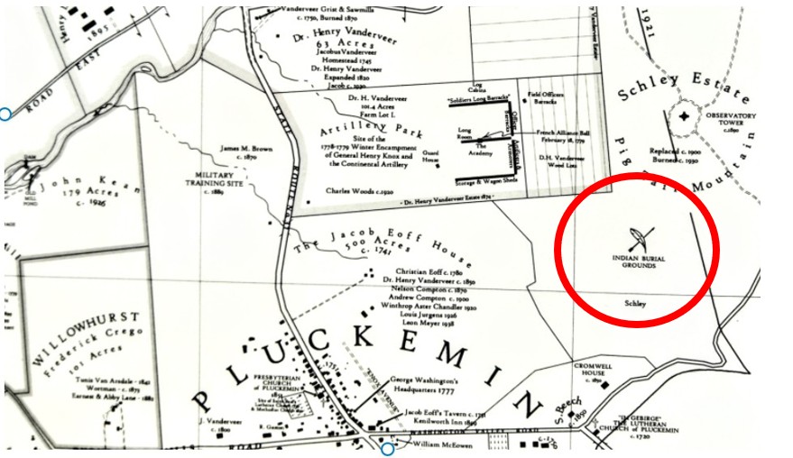 While doing research, I also came across a mention of what appears to have been an Indian burial ground on Pigtail Mountain in Bedminster, New Jersey. While documentation is very limited, we did find a map from the John Smith Map Collection identifying the burial ground we’ve heard of. If you look in the lower right-hand corner of the map, you’ll see the marking of what was an “Indian Burial Ground.” We discussed this with some people from the nearby Pluckemin Dig, who also mentioned a hidden burial at the southern tip of the mountain range, just north of Interstate Route 78 East, most likely from the 1600s.