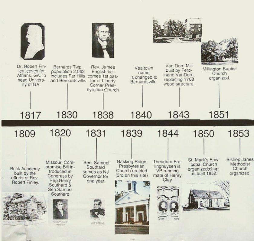 Take a visual tour of a great document that showcases key historic activities that occurred in Bernards Township. The timeline was prepared by former historian June Kennedy honoring the 250th anniversary and history of Bernards Township in 2010. In 2021 the Mr. Local History Project updated the timeline to the present.