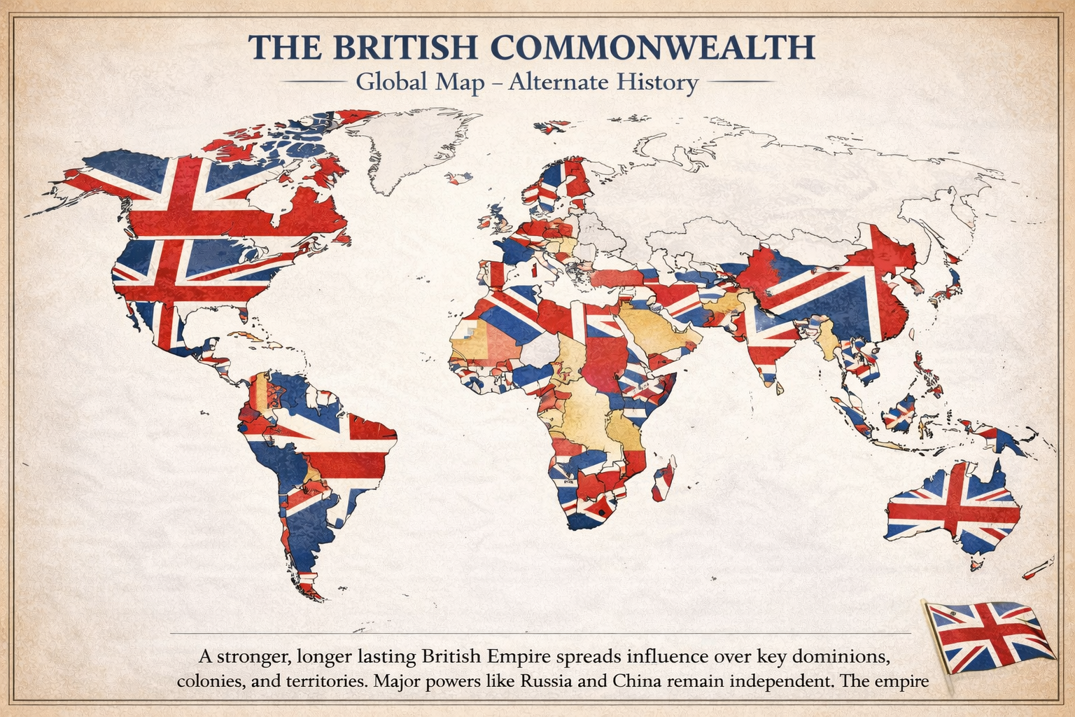 Britain absorbs the near disaster and adjusts. Parliament reforms imperial governance not out of generosity but survival. Taxes become predictable. Representation expands slowly and carefully never equal but sufficient to prevent another uprising. By the turn of the century the colonies are reorganized as a Dominion of North America within the British Empire. Foreign policy remains firmly in London while limited local governance is tolerated so long as loyalty is maintained. Empire adapts instead of fractures.