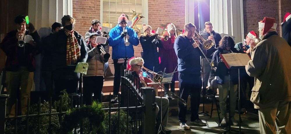 Anyone can join to play. You are to arrive at Westminster Hall (BRPC) at 6:00 pm. The “Carol Sing on the Green” for those who wish to sing typically brings a flashlight or a cell phone with a flashlight app to read the carol sheets offered to anyone starting at about 6:45 pm. The attendees sing 9 songs (the same every year), and the singing comes to a close with a generous ringing of the church bells from the Presbyterian and Methodist churches. Then, the area’s church doors open for an early service, and neighbors or strangers wish each other a Merry Christmas and go their separate ways. By 7:25, the green is deserted.