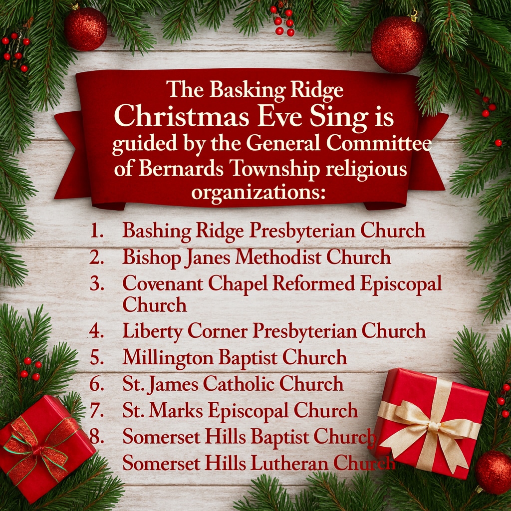 Every year on December 24th, at 7 pm on the ” Town Green,” residents, families, friends, and guests gather in Basking Ridge, New Jersey, singing Christmas carols, wishing good tidings, and then moving on to their family traditions. Join the community and celebrate the 100th anniversary as the Church bells begin ringing at 7 pm. Nine songs are sung, and the caroling ends around 7:35 pm, again with a round of ringing church bells. The “Christmas Eve Sing” is the oldest continuous Christmas Eve sing in New Jersey.