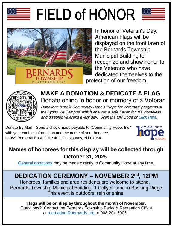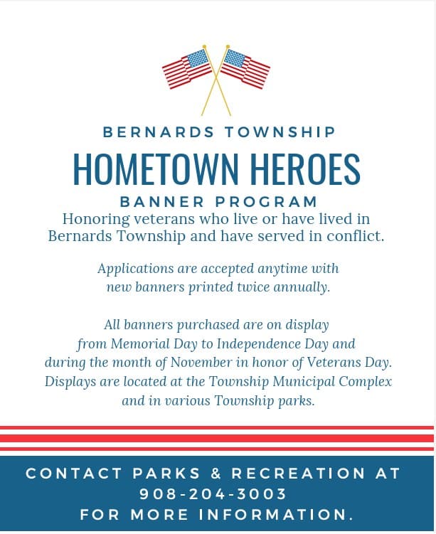 Bernards Township Program—A suggested donation of $75 helps offset the cost of banner production. Any resident who’d like to participate can contact the Bernards Township Veterans Task Force.