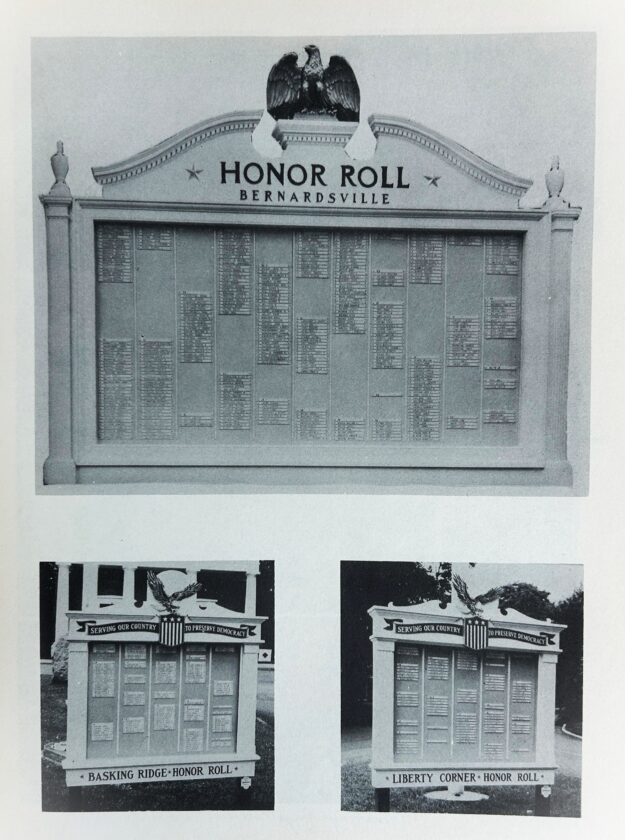 During World War II, an effort was made to honor local service members with three honor roll boards. These billboards were built and anchored at the centers of Basking Ridge, Liberty Corner, and Bernardsville, maintained by the townships with the support of the Somerset Hills Military Service Committee. They were later relocated to the Municipal Complexes, where they fell into disrepair and were removed around 2005.