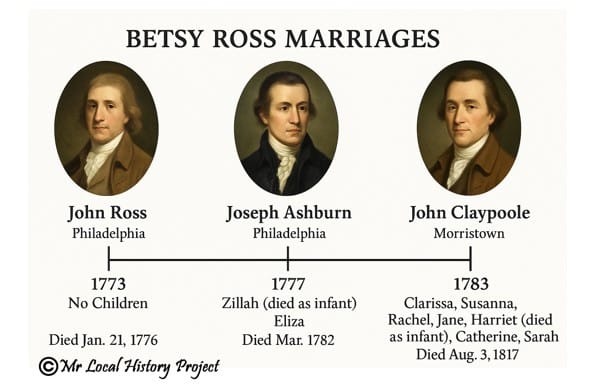 Betsy Ross’s name at her death was actually Elizabeth (Betsy) Griscom Ross Ashburn Claypoole. Claypoole was a Morris County man.