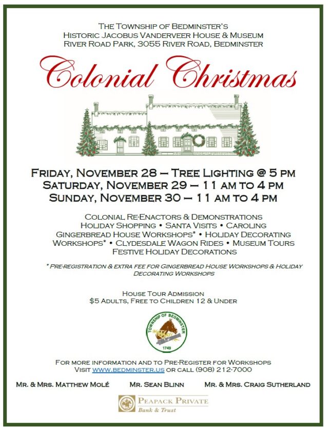 Bedminster Township’s Jacobus Vanderveer House Colonial Christmas event is back! We look forward to you joining us on November 28-30 for Bedminster’s Colonial Christmas, starting with their annual Tree Lighting, a free public event featuring carolers, hot chocolate and hot pretzels, Santa, and an Open House!