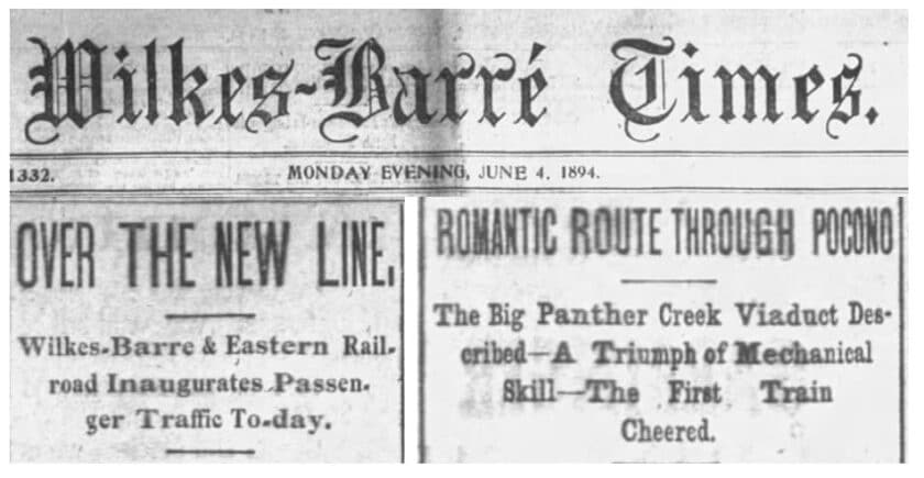 On June 4, 1894, the Wilkes-Barre & Eastern Railroad inaugurated its first passenger service with little fanfare but much significance, offering a scenic and efficient new route through Pennsylvania’s Pocono Mountains. The journey featured engineering marvels like the towering Panther Creek Viaduct—then the highest and one of the longest railroad bridges in the country—constructed with remarkable speed and precision. Designed to be a “Short Line” to New York City, the route offered passengers breathtaking views, gentle grades, and a safer, more direct connection compared to older, more circuitous paths. The article praised both the natural beauty and technical achievement of the railway, highlighting its nineteen stations and promising a new era of travel between Wilkes-Barre and the metropolitan east.