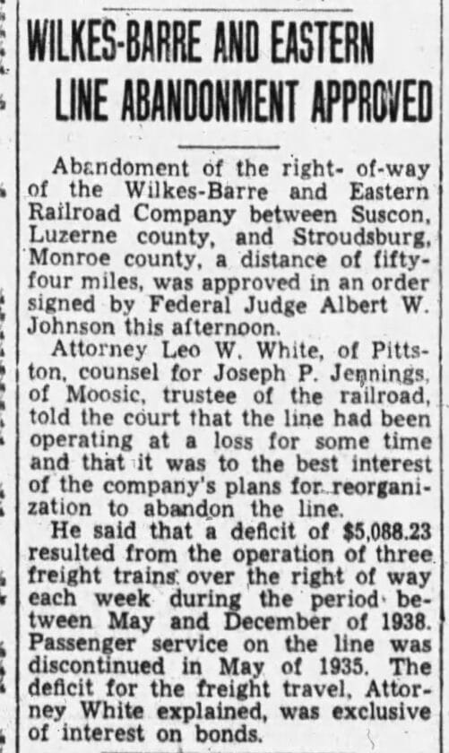 The Wilkes-Barre & Eastern Railroad officially came to an end on March 21, 1939, when a federal judge approved the abandonment of its 54-mile right-of-way stretching from Suscon in Luzerne County to Stroudsburg in Monroe County. The decision marked the final chapter in a line that had served northeastern Pennsylvania since 1892, initially built to transport anthracite coal, ice, lumber, and passengers across the Pocono Plateau. By the late 1930s, however, the railroad had become a financial burden. Passenger service had already been discontinued in May of 1935 due to declining ridership, and the remaining freight operations—just three trains per week—could no longer justify the cost of keeping the line active.