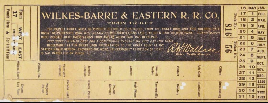 There are nineteen stations between this city and the point of connection with the parent road as follows: Wilkes-Barre, Ashley, Georgetown, Laurel Run, Miners’ Protection, Langon Switch, Summit Switch, Viaduct, Ash Gap Switch, Lehigh, Stoddart, Pocono Summit, Half Moon Switch, Bearersville, Kinders, Dreher, Keeler, Battysville Shops, Stroudsburg and Wilkes-Barre and Eastern Junction.