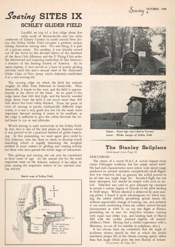 Located on top of a low ridge about five miles south of Bernardsville and two miles southwest of Liberty Corner in north-central New Jersey, the Schley Glider Field occupied a unique position among American soaring sites. For one thing, it was part of a private estate; for another, it was literally carved out of the forest by the devoted labors of members of the Aero Club Albatross and the Y Flying Club under the determined leadership of Gus Scheurer, a director of the Soaring Society of America.