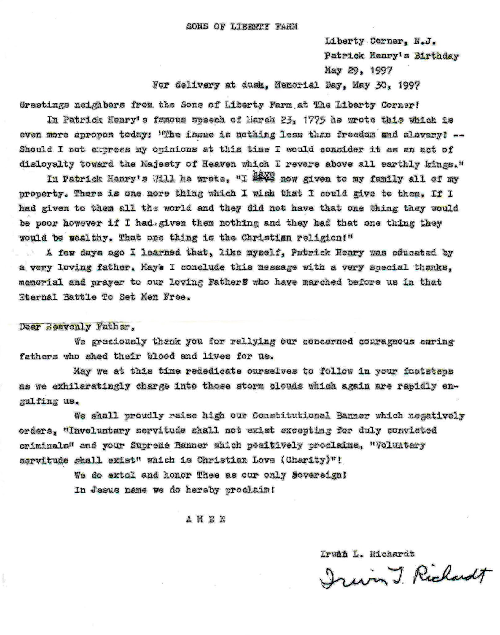 Irwin Richardt was born on August 6, 1928, and grew up on what was known as the Sons of Liberty Farm. At his boyhood home, the 22-acre Sons of Liberty Farm, located at Allen and Somerville Road, the Richardts lived in an 18th-century farmhouse and tapped maple syrup from trees there. He gained local notoriety for his colonial-era lifestyle, his tributes to the founding fathers, and his crusades against what he saw as unjust taxes, intrusive laws, and government control.