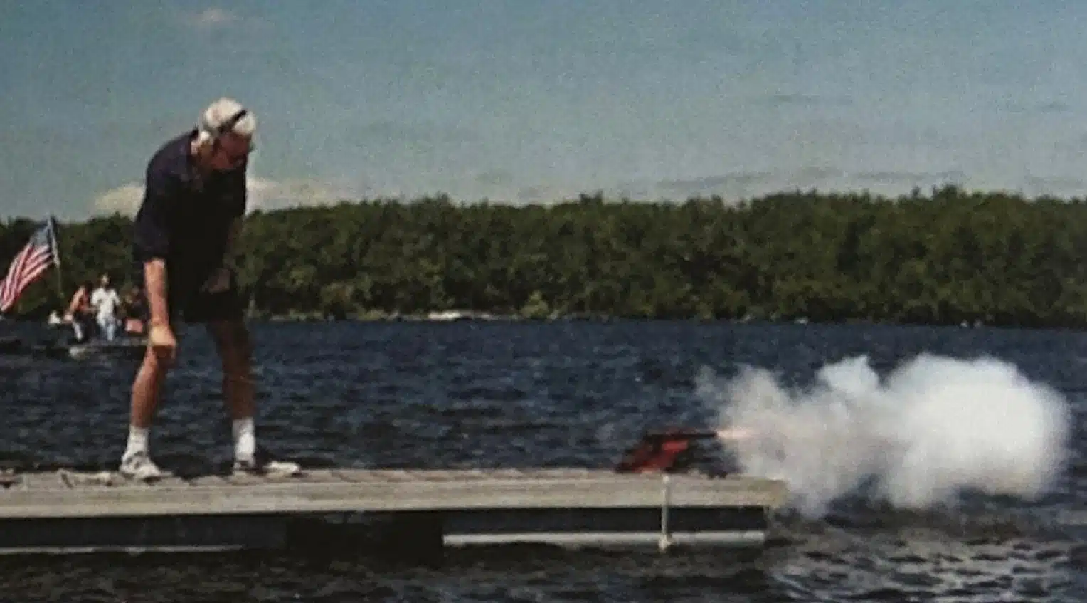 Through the Owaissa camp days and up until the late 1960s, the LN Sailing Association used a small cannon like this one (using powder but no shell) to signal the white flag (10 min til start) the blue flag (5 min til start) and a red flag at the start of each race. Custom was to have the cannon pointed off the back side of the Contiki pontoon boat that was used as one end of the race starting line by the race officials. Then, one day, one of the junior racers named Hope Kaltenthaler came around the back side of the pontoon boat just as the cannon was fired for the 5 min to go signal before the race started. She got a nasty powder burn to the face but was otherwise OK, and that was the end of the cannon, replaced with an air horn.”