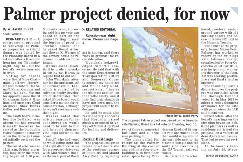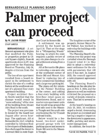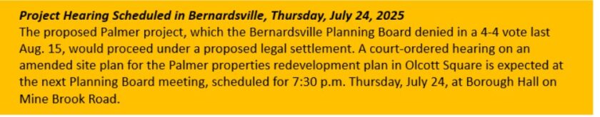 To respect Bville News and subscribers, here’s the heading and part of the story shared with subscribers on Thursday, July 31, 2025, summarizing the public hearing held on July 24 and stating that the Palmer Project is a train. It’s moving forward with a slight modification that reduces the number of living spaces from 68 to 67. The project was previously denied by the board last August after seven hearings. The applicant, AR at Bernardsville, LLC, which Advance Realty Developers of Bedminster control, then challenged the denial in a lawsuit filed in state Superior Court in Somerville.