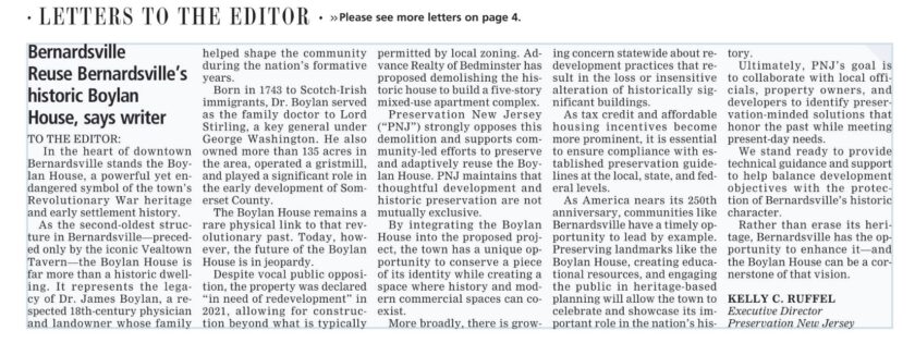 Kelly Ruffel, Executive Director of Preservation New Jersey, weighed in again with a Letter to the Editor at the Bernardsville News July 24, 2025