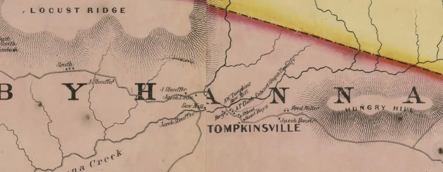 We begin the journey looking at maps, and I landed on a 1860 map of Monroe County and the Pocono Mountains west of Easton and Stroudsburg. Among the three contiguous settlements of Tomkinsville, Hauser’s Mill, and Millertown (now comprising Pocono Lake and Pocono Pines), one could find a post office, a hotel, three stores, two clothespin factories, two saw mills, a shoe peg factory, a blacksmith, a wheelwright shop, and roughly fifty dwellings.