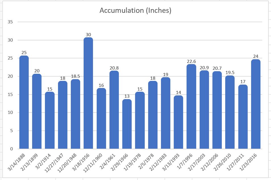 The largest snow accumulation in recent memory was the 26 inches on January 23, 2016. That storm was the 3rd largest dumping recorded in the area.
