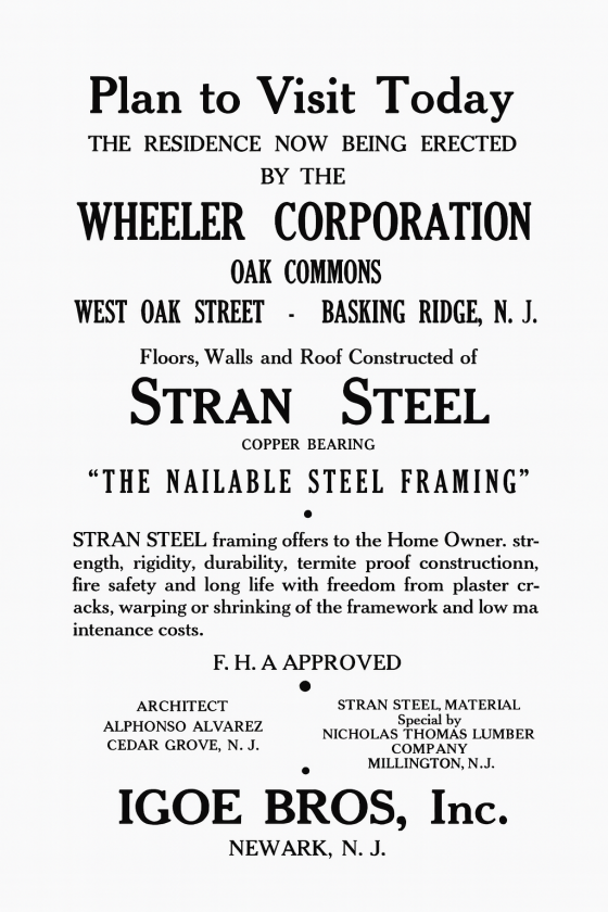An advertisement said floors, walls, and roof would be constructed of Stran Steel framing, which offers “strength, rigidity, durability, termite proof construction, fire safety, and long life with freedom from plaster cracks, warping or shrinking of the framework and low maintenance costs.”
