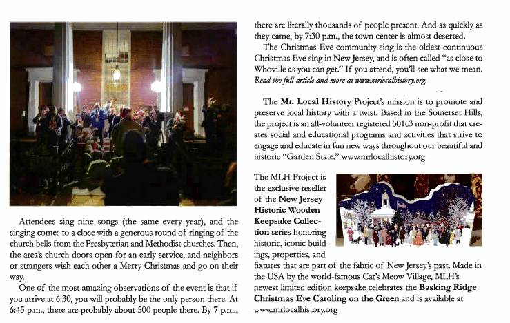 The MLH Project is the exclusive reseller of the New Jersey Historic Wooden Keepsake Collection, honoring iconic buildings, properties, and fixtures that are part of the fabric of New Jersey’s past. Made in the USA by the world-famous Cats Meow Village, MLH’s newest limited edition keepsake celebrates the Basking Ridge Christmas Eve Caroling on the Green and is available at www.mrlocalhistory.org