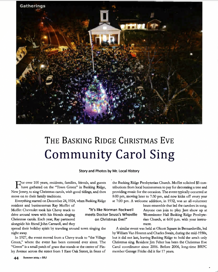 A similar event was held at Olcott Square in Bernardsville, led by William Van Houten and Charles Swain during the mid-1930s, but it did not last, leaving Basking Ridge to hold the area’s only Christmas sing. Resident Jim Felter has been the Christmas Eve Carol coordinator since 2006. Before 2006, long-time BRPC member George Fricke did it for 17 years.